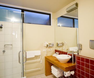 Deze ruime kamer heeft een eigen badkamer met uitzicht op de tuin.